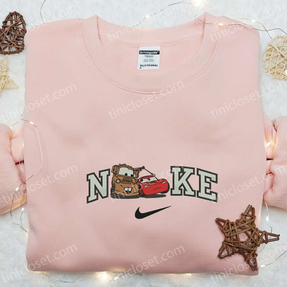 Nike X Cars Lightning Mcqueen And Tow Mater Embroidered Sweatshirt, Disney Pixar Cars Embroidered Hoodie, Custom Nike Embroidered T-shirt