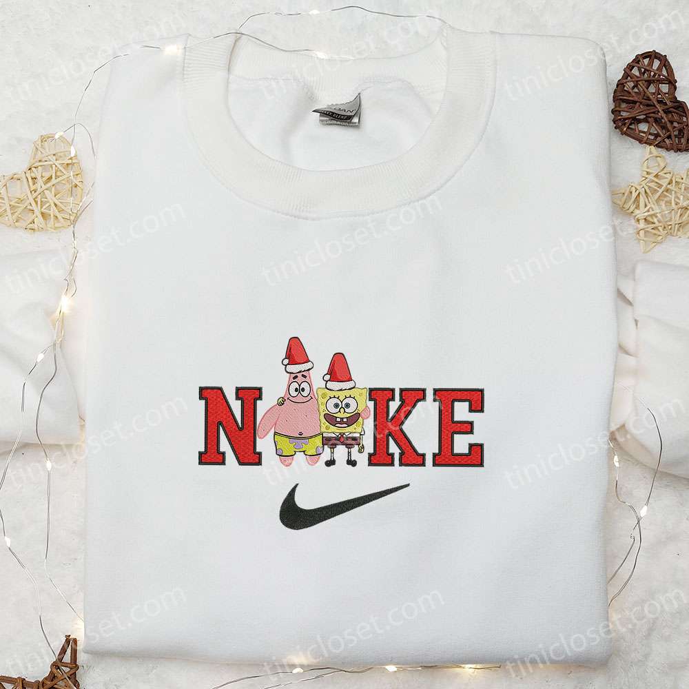 Nike X Christmas Patrick Star And Spongebob Embroidered Shirt, Custom Nike Embroidered Hoodie, Cartoon Characters Embroidered T-shirt