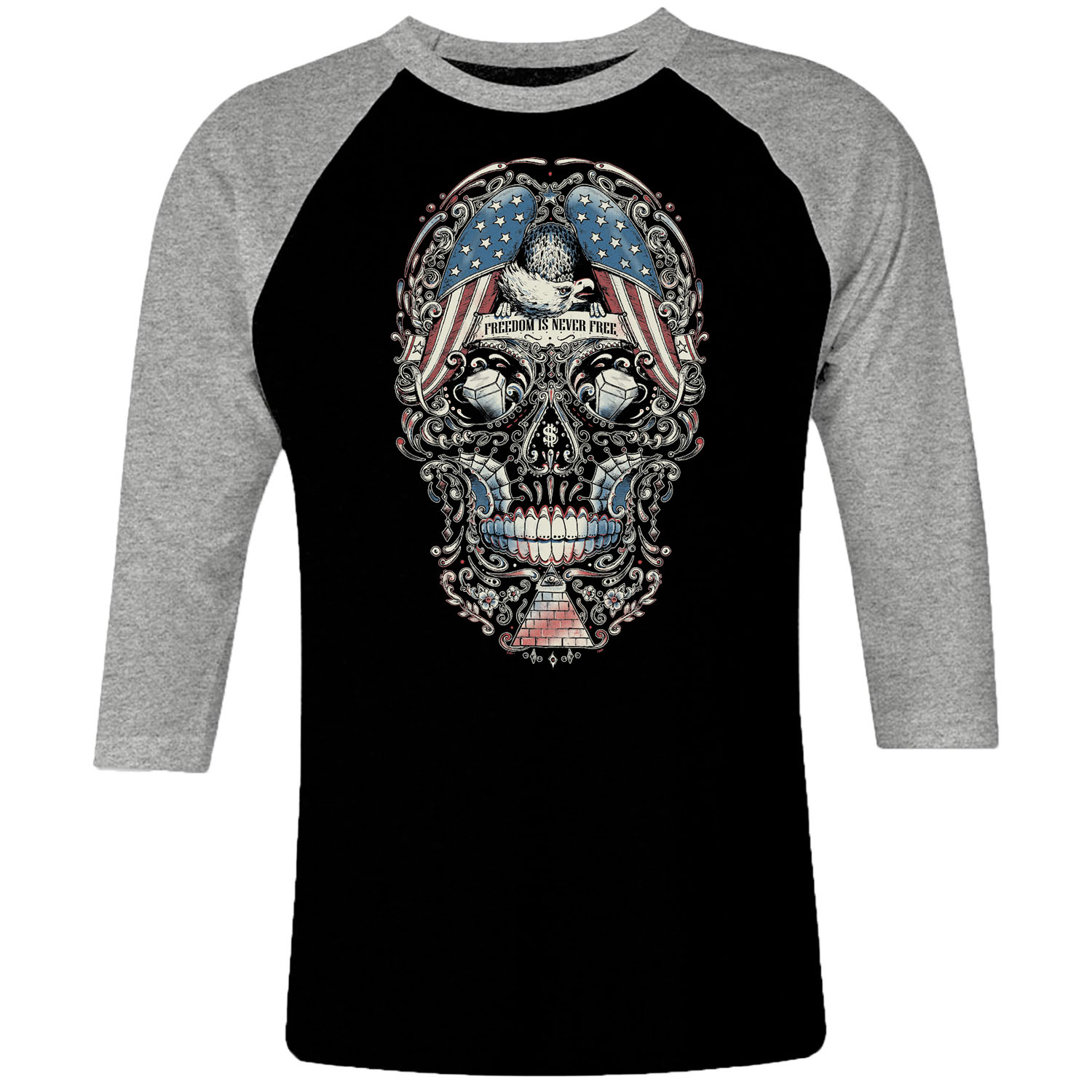 1cp I 026 Skull Freedom Is Never Free Raglan T Shirt 3 4 Sleeve Rock Band Metal Retro Punk Vintage Concert Cotton Design Handmade Logo New
