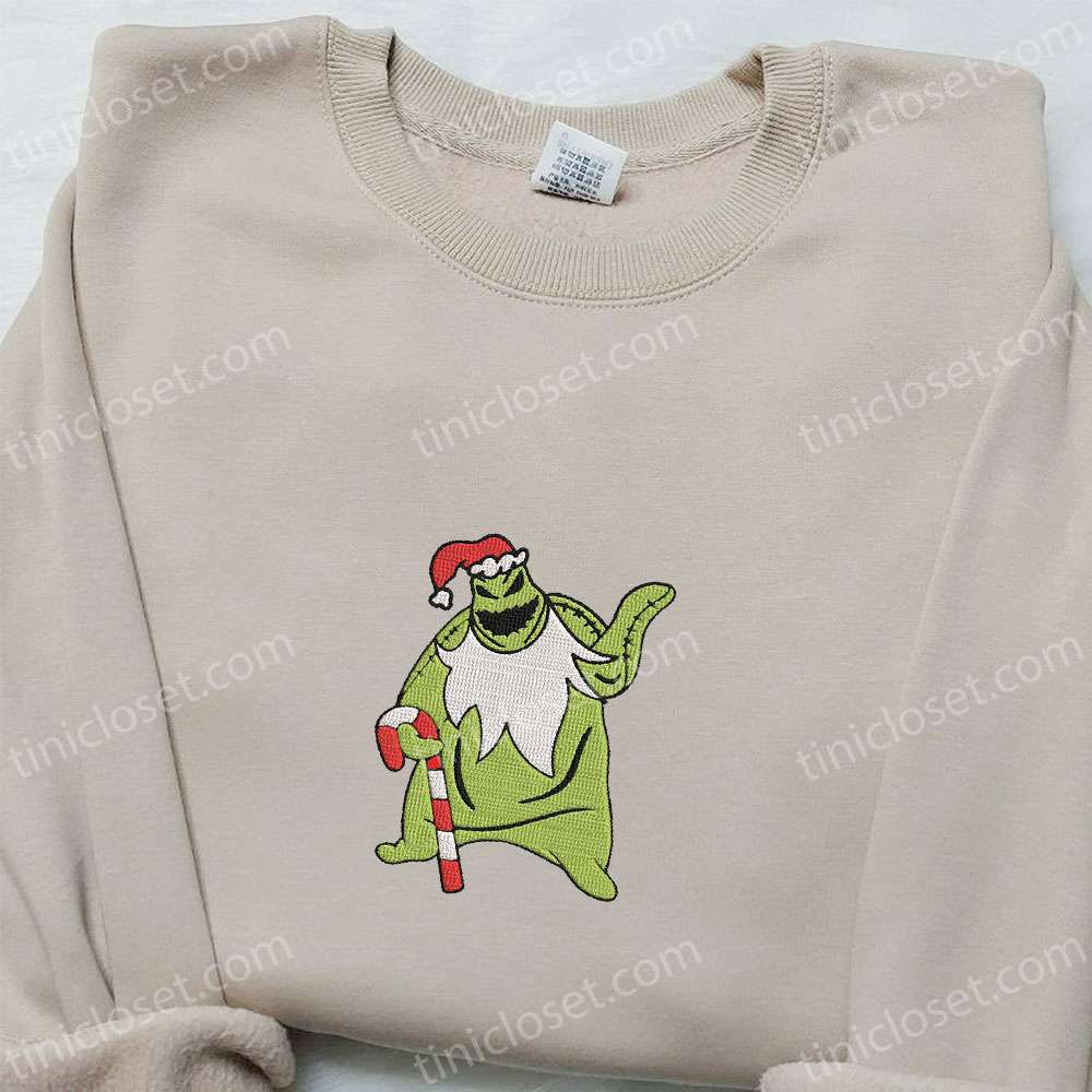 Oogie Boogie With Candy Cane Embroidered Shirt, The Nightmare Before Christmas Cartoon Embroidered Hoodie, Christmas Embroidered Sweatshirt