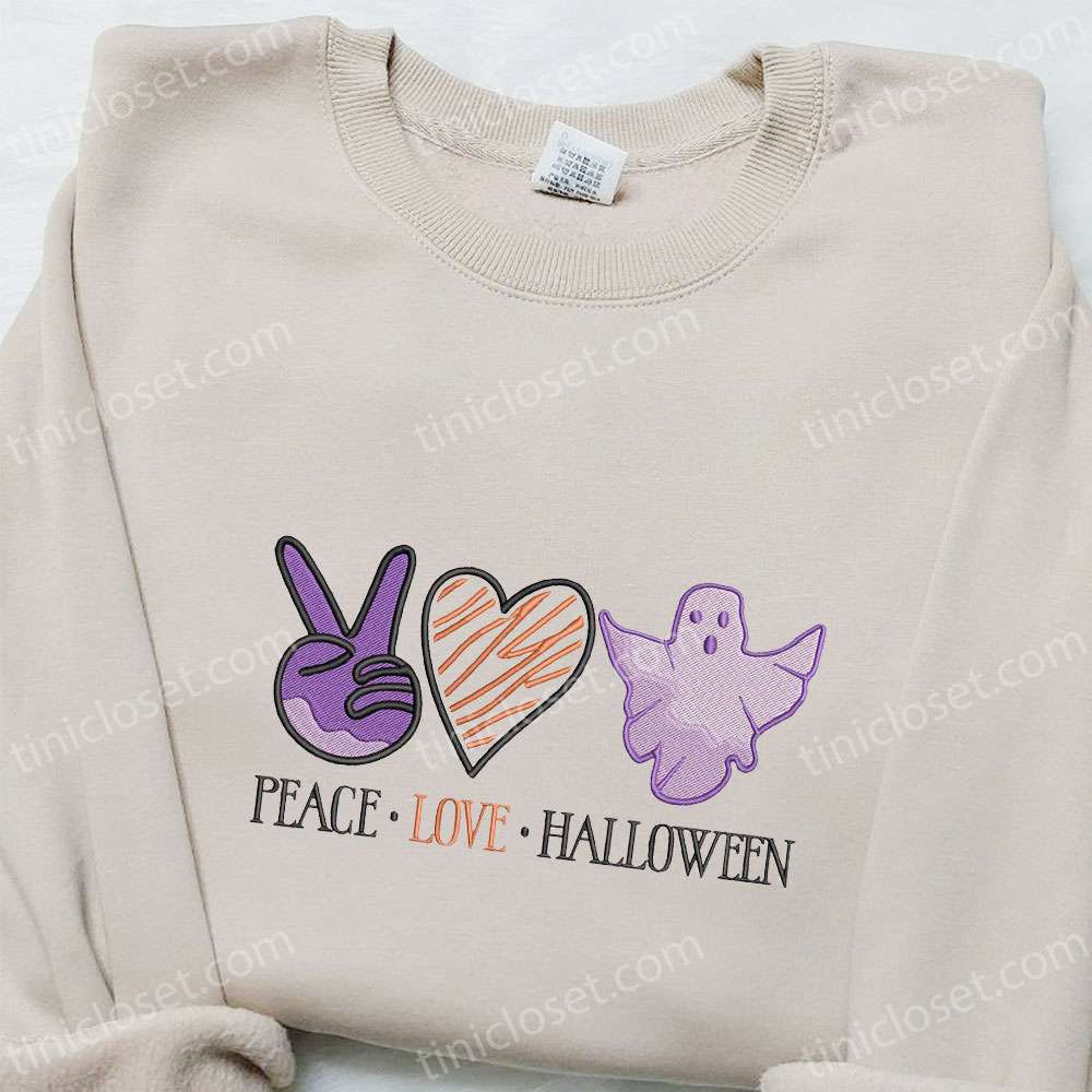 Peace Love Halloween Embroidered T-shirt, Halloween Embroidered Shirt, Best Halloween Gift Ideas