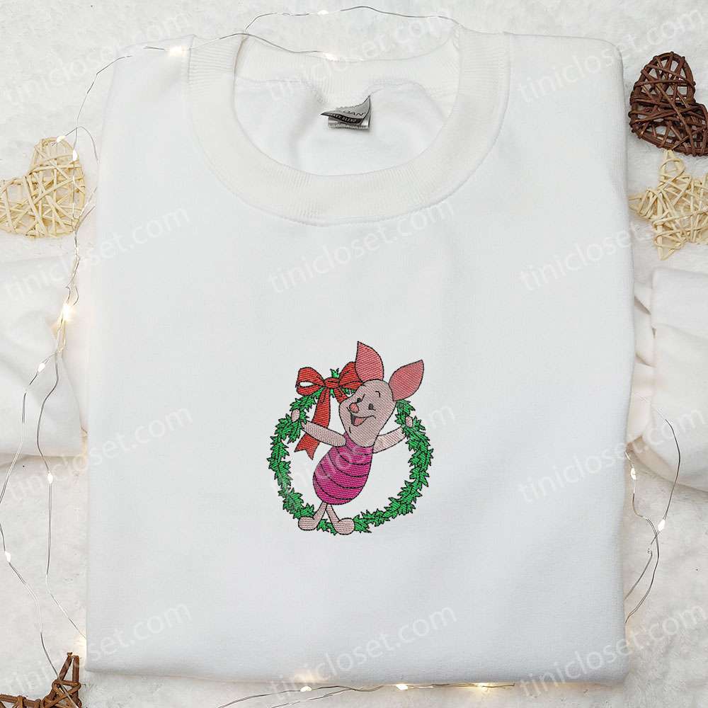 Piglet Christmas Wreath Embroidered Shirt, Disney Winnie The Pooh Embroidered Hoodie, Best Christmas Gifts For Family