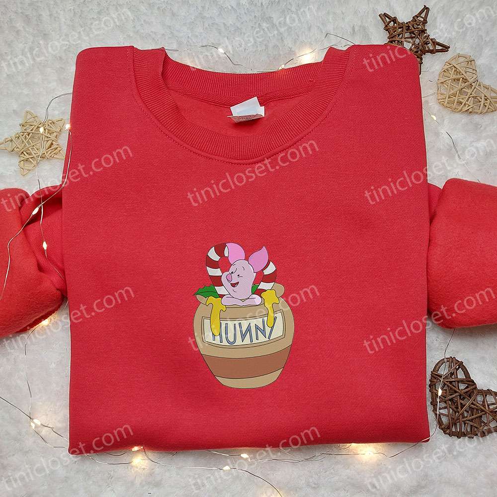Piglet In Honey Pot With Candy Canes Embroidered Shirt, Disney Characters Embroidered Hoodie, Christmas Embroidered Sweatshirt