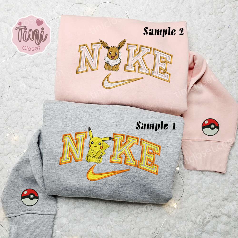 Pikachu And Eevee X Nike Couple Embroidered Shirt, Pokemon Anime Embroidered Hoodie, Nike Inspired Embroidered Sweatshirt