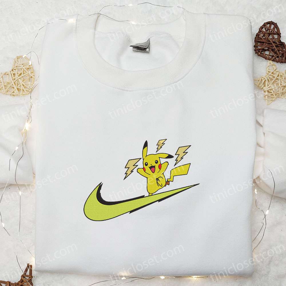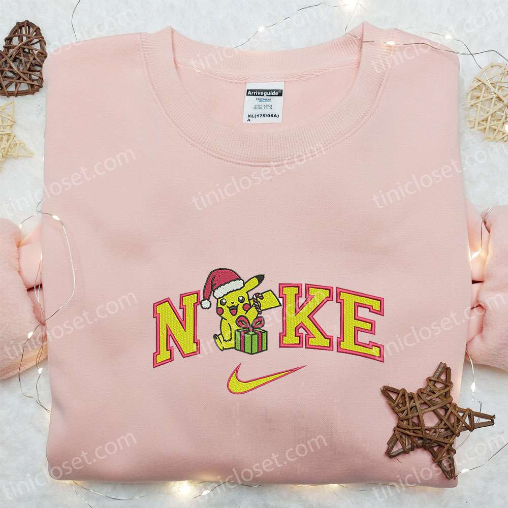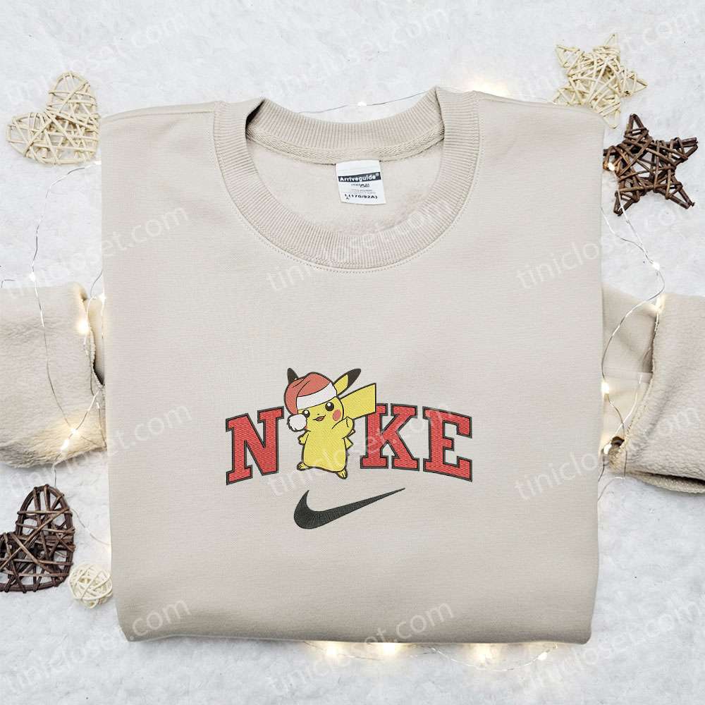 Pikachu Xmas X Nike Swoosh Embroidered Shirt, Pokemon Anime Embroidered Hoodie, Nike Inspired Embroidered Sweatshirt