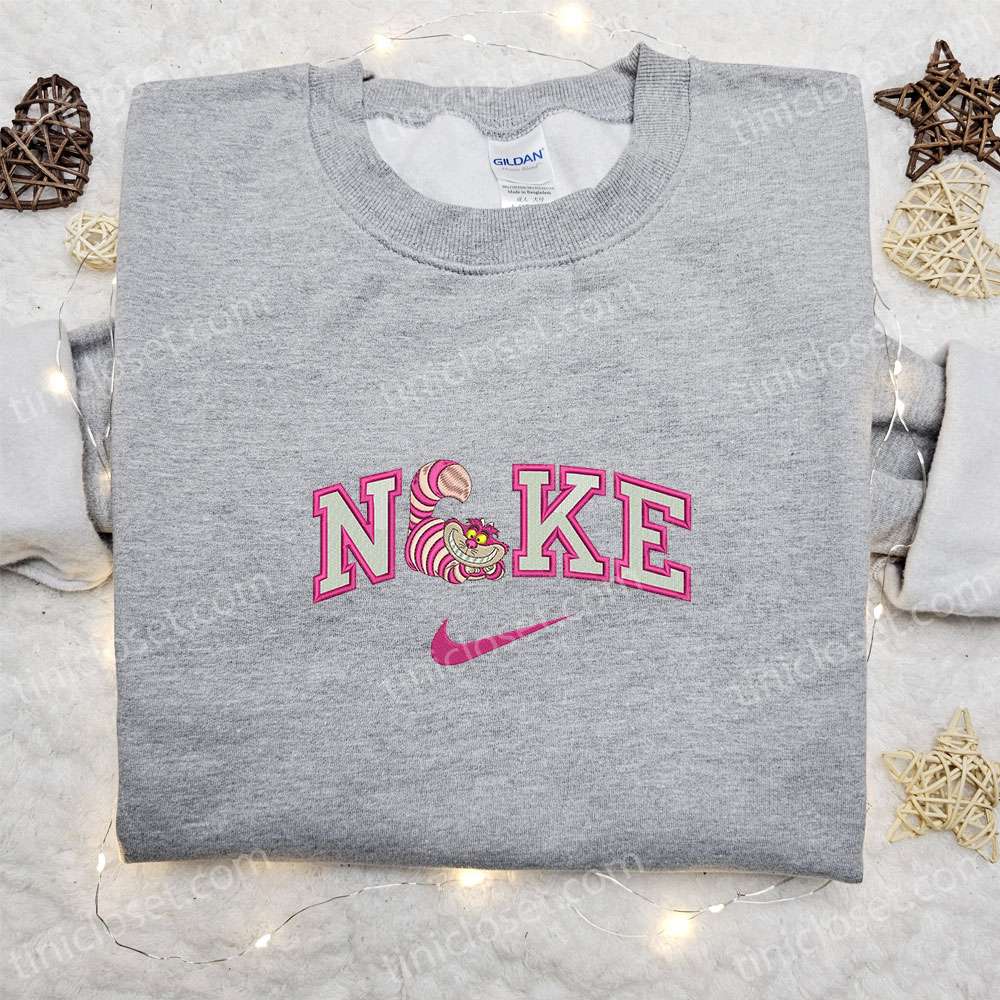 Pink Cheshire Cat X Nike Embroidered Shirt, Disney Alice In Wonderland Embroidered Hoodie, Cartoon Embroidered Sweatshirt