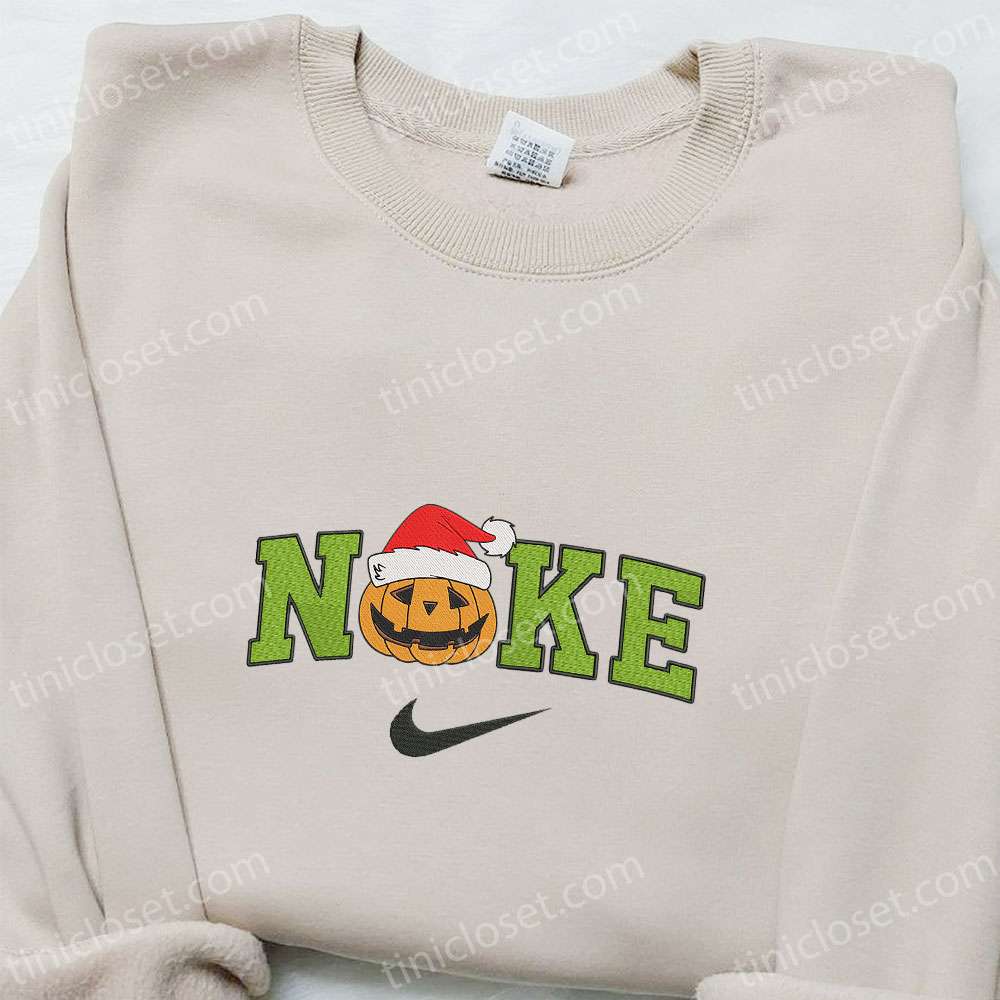 Pumpkin With Christmas Hat X Nike Embroidered Sweatshirt, Cartoon Christmas Embroidered Shirt, Best Christmas Gift Ideas