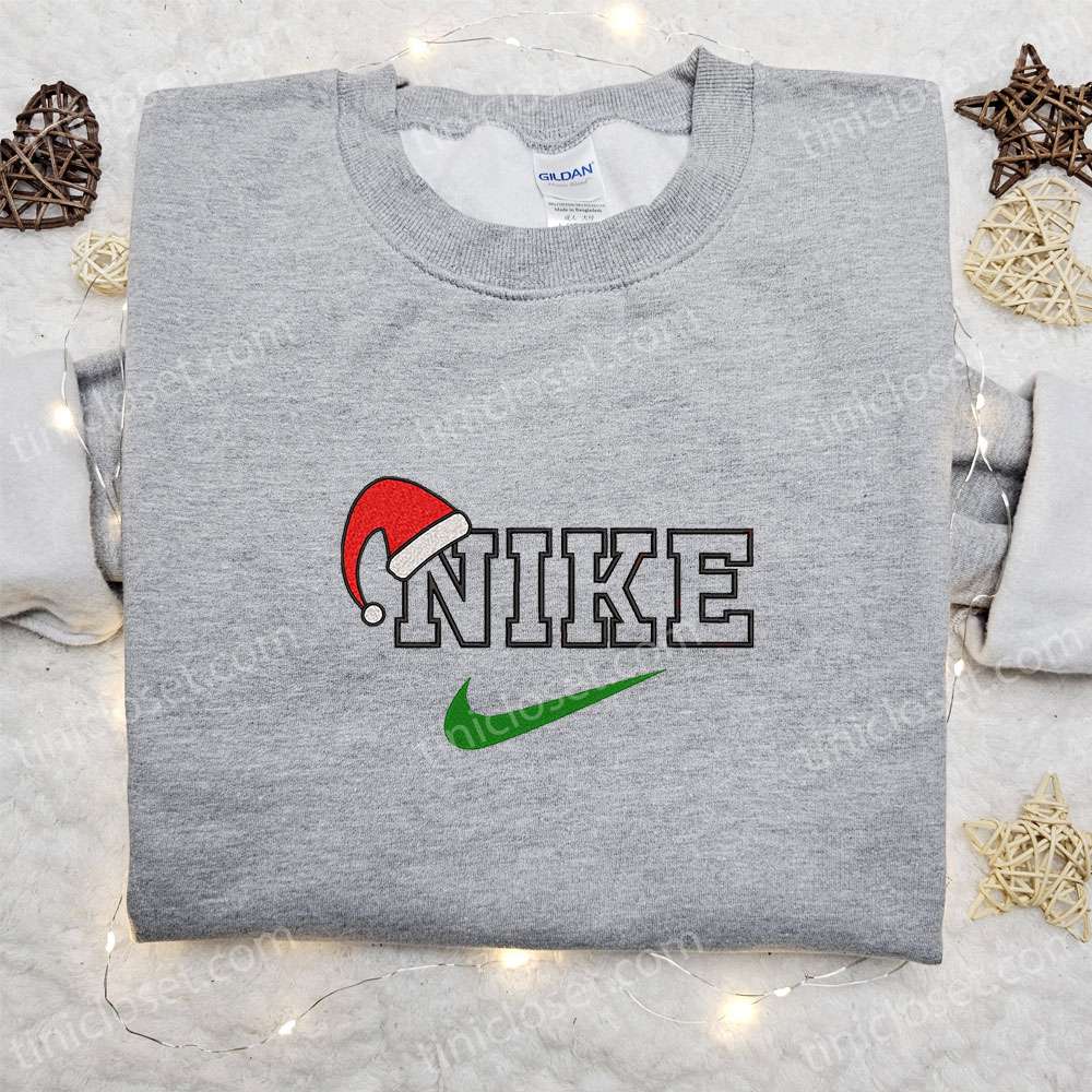 Santa Hat X Nike Embroidered Shirt, Christmas Embroidered Hoodie, Nike Inspired Embroidered Sweatshirt