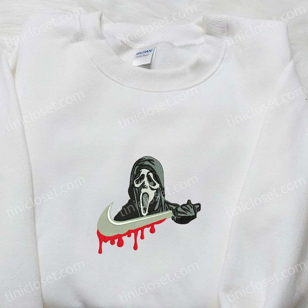 Scream Ghostface X Nike Swoosh Embroidered Shirt, Horror Movie Embroidered Hoodie, Halloween Embroidered Sweatshirt