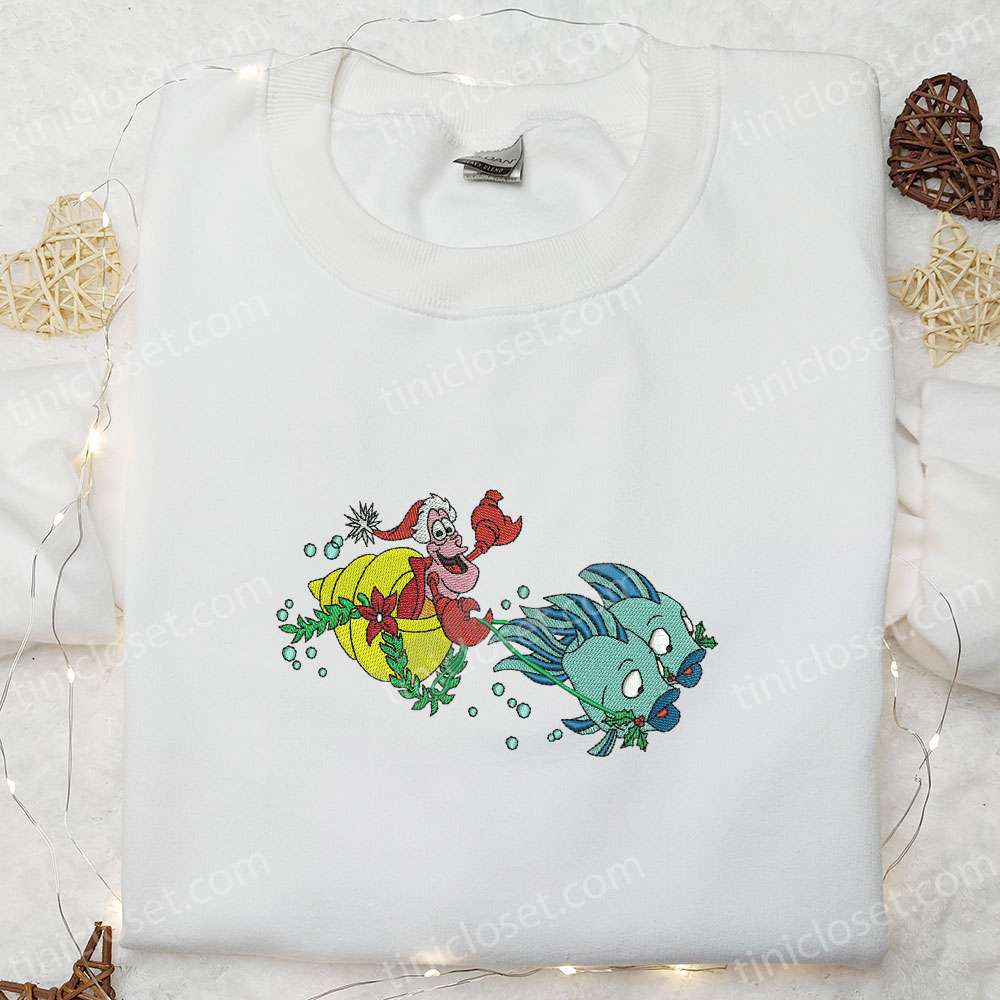 Sebastian Riding Fish Sleigh Embroidered Shirt, Disney Little Mermaid Embroidered Hoodie, Christmas Embroidered Shirt