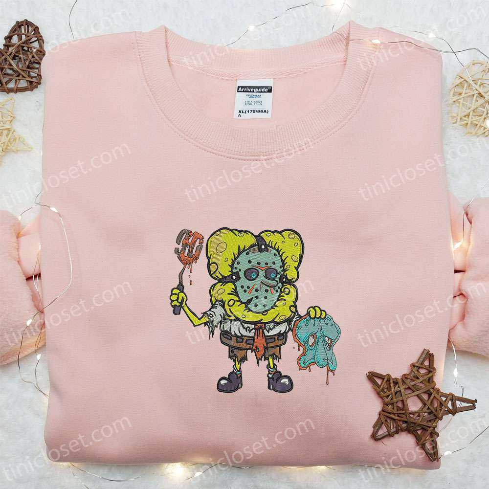 Spongebob Jason Voorhees Embroidered T-shirt, Cartoon Horror Movie Embroidered Hoodie, Best Gift Ideas