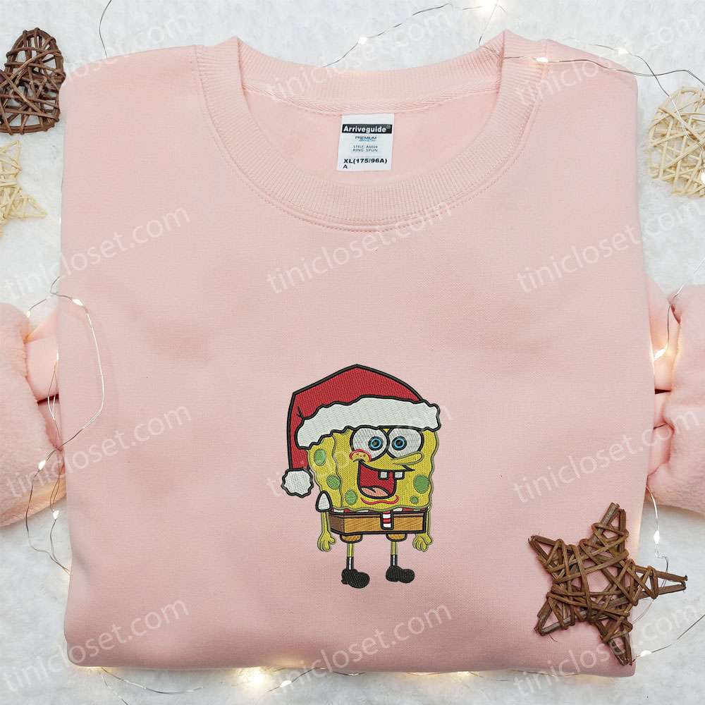 Spongebob Santa Hat Embroidered Shirt, Cartoon Embroidered Hoodie, Best Christmas Gifts For Family