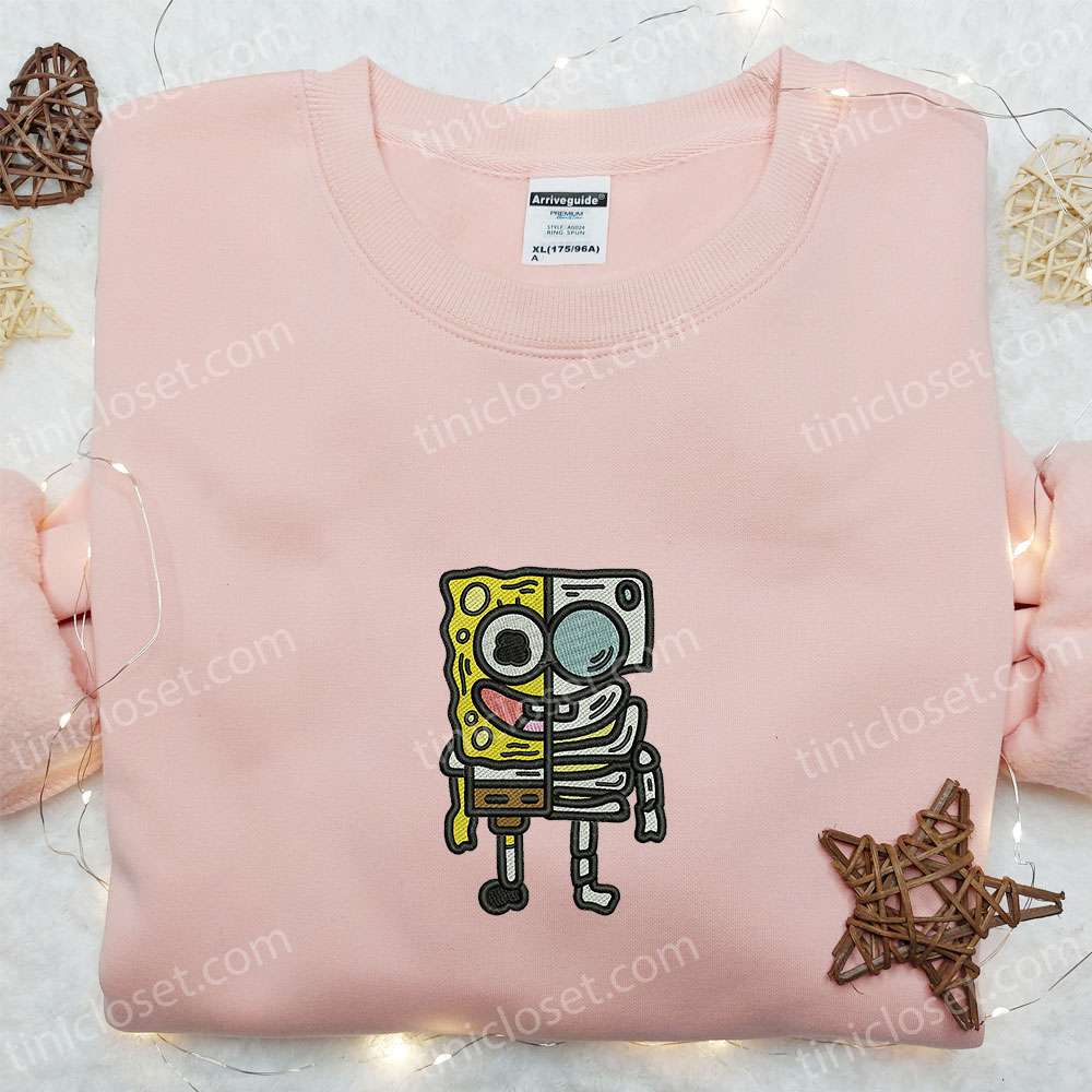 Spongebob Skeleton Embroidered Shirt, Spongebob Squarepants Cartoon Embroidered T-shirt, Best Gift Ideas For Family