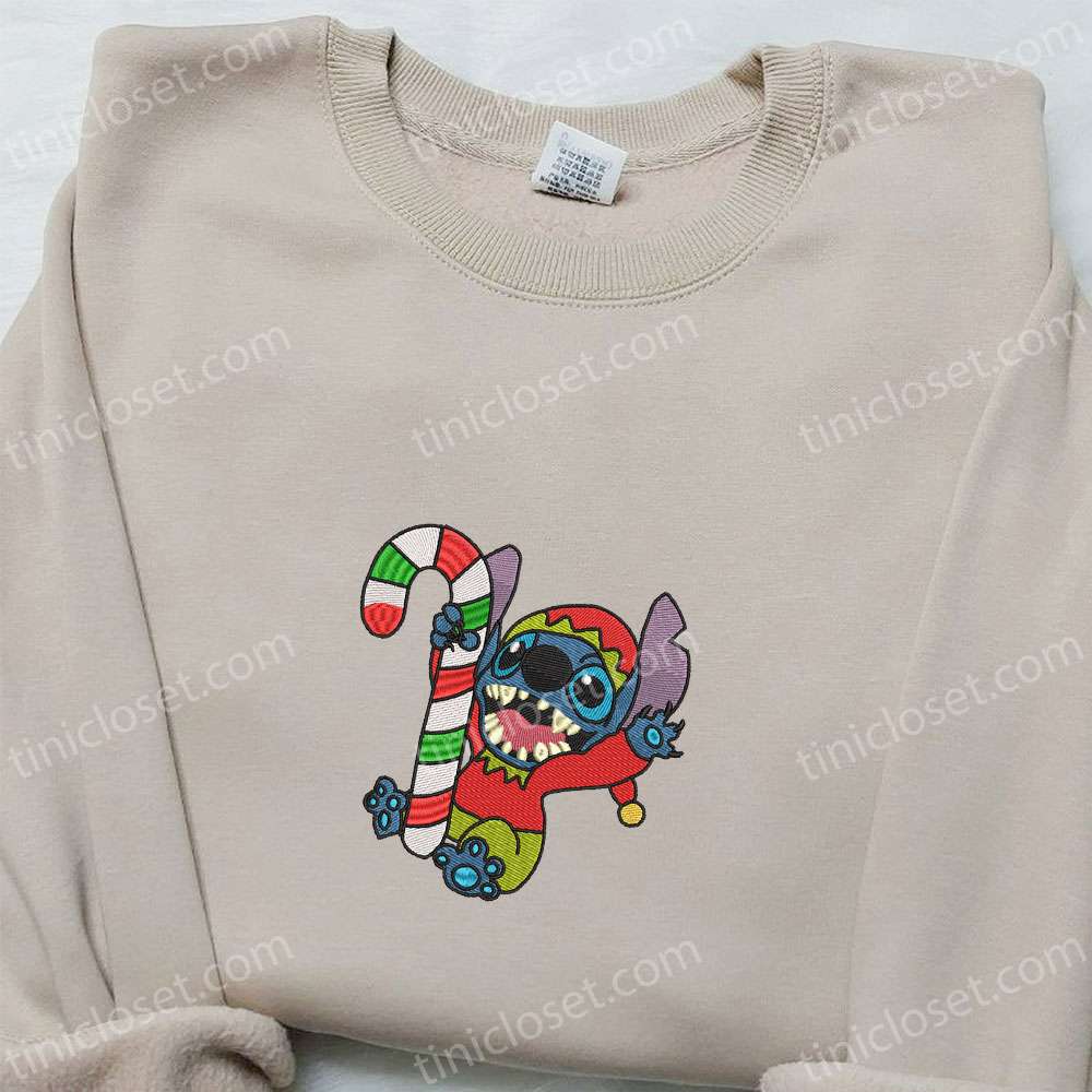 Stitch Elf With Candy Cane Embroidered Shirt, Disney Characters Embroidered Hoodie, Christmas Embroidered Sweatshirt