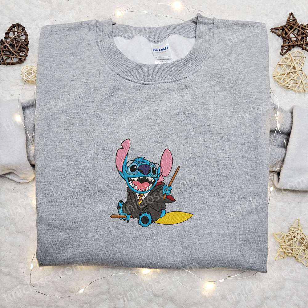 Stitch Harry Potter Broomstick Embroidered Shirt, Disney Characters Embroidered Hoodie, Best Halloween Gift Ideas
