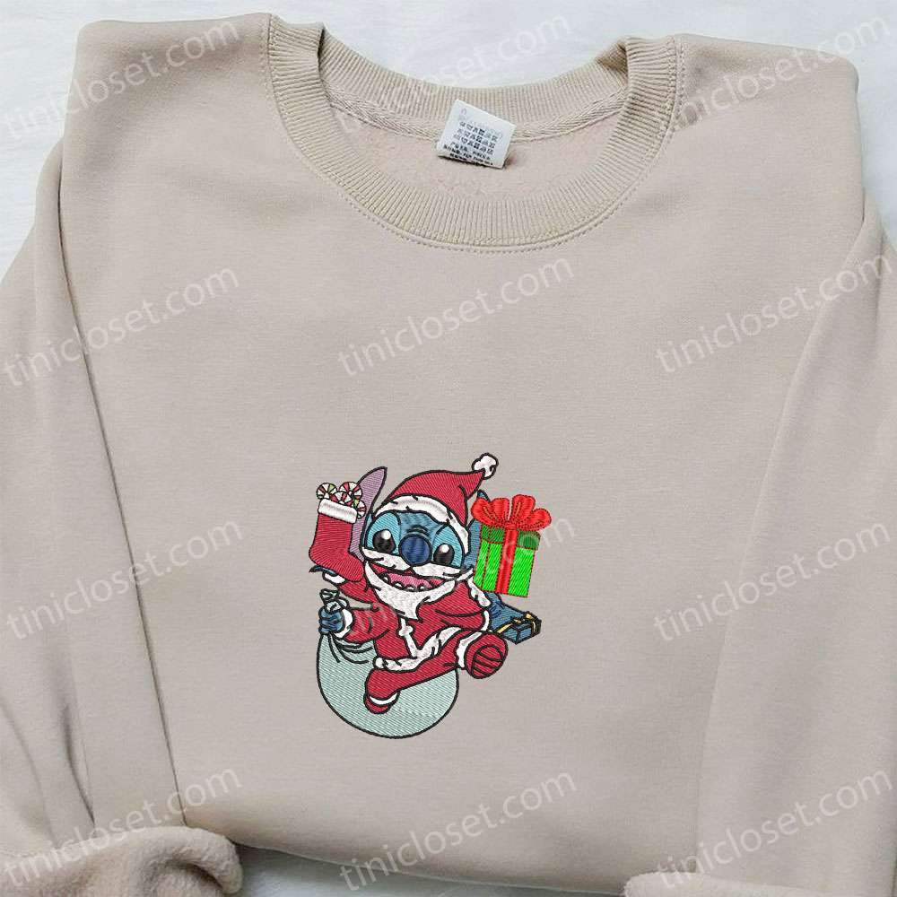 Stitch Santa With Christmas Gifts Embroidered Shirt, Disney Characters Embroidered Hoodie, Christmas Embroidered Sweatshirt