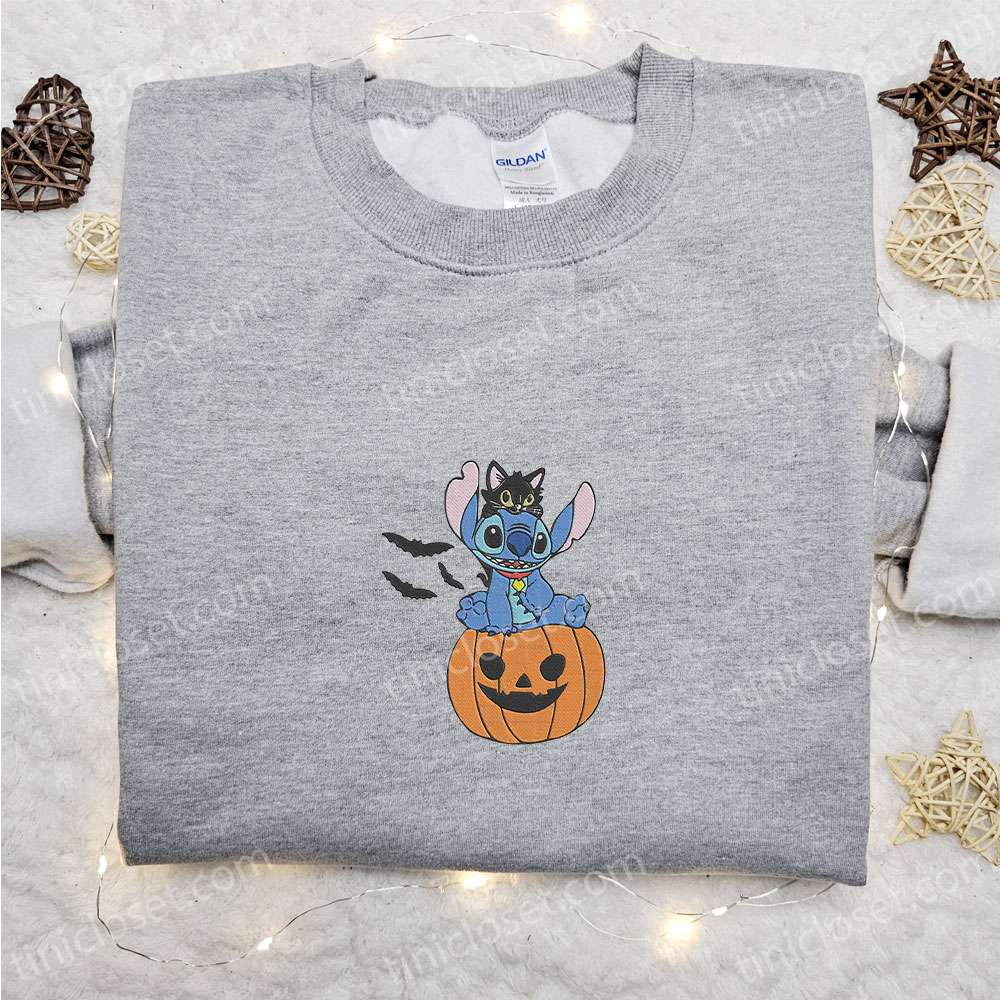 Stitch Sitting On Pumpkin With Black Cat Embroidered Sweatshirt, Disney Characters Embroidered Hoodie, Best Halloween Gift Ideas