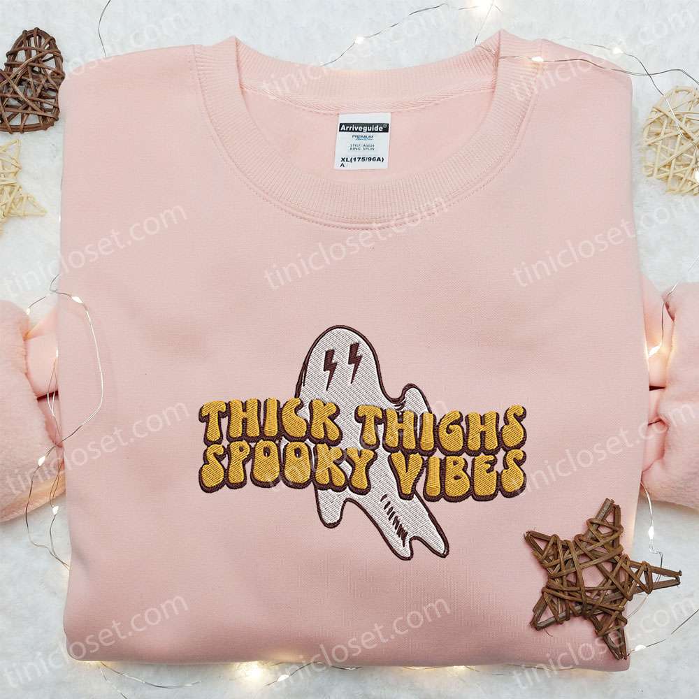 Thick Thighs Spooky Vibes Ghost Embroidered Shirt, Halloween Embroidered Hoodie, Best Gifts For Family