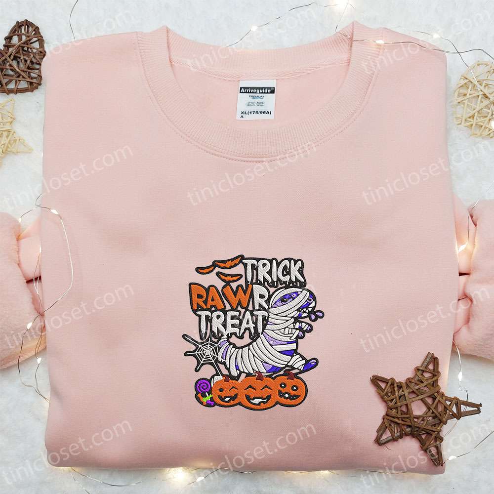 Trick Rawr Treat Mummy T-rex Embroidered Shirt, Halloween Embroidered Hoodie, Best Halloween Gift Ideas