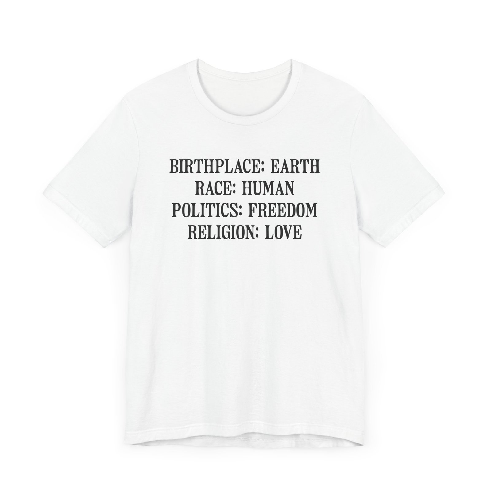 Birthplace Earth Race Human Politics Freedom Religion Love T-shirt