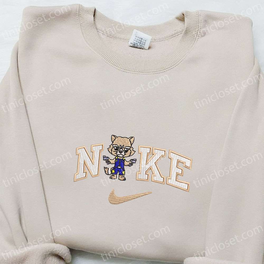 Chibi Rocket Racoon X Nike Swoosh Embroidered Shirt, Guardians Of The Galaxy Movie Embroidered Hoodie, Marvel Characters Embroidered Sweatshirt