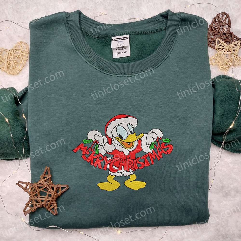 Donald Duck Merry Christmas Embroidered Shirt, Disney Characters Embroidered Hoodie, Christmas Embroidered Sweatshirt