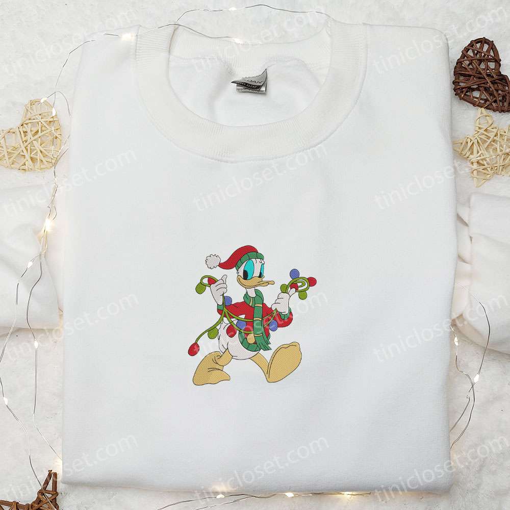 Donald Duck With Christmas Lights Embroidered Shirt, Disney Characters Embroidered Hoodie, Christmas Embroidered Sweatshirt