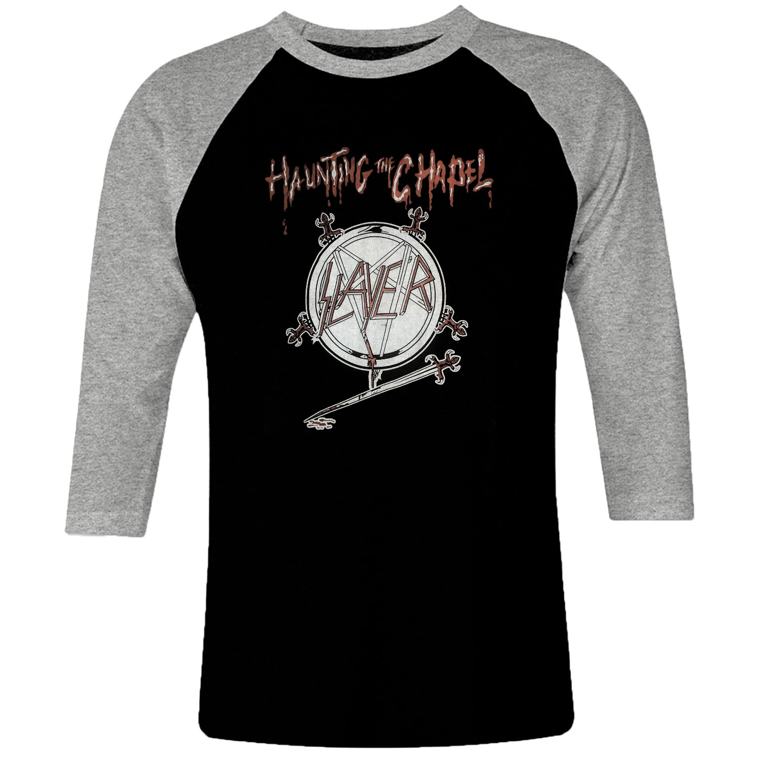 1 I 106 Slayer Haunting The Chapel Raglan T Shirt 3 4 Sleeve Rock Band Metal Retro Punk Vintage Concert Cotton Design Handmade Logo New