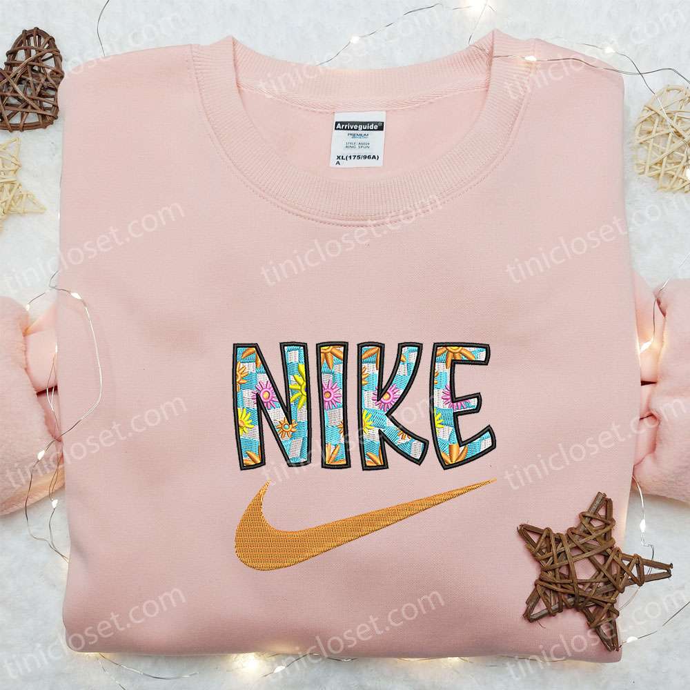 Flower Nike Logo Embroidered Shirt, Nike Inspired Embroidered Hoodie, Best Gifts For Family