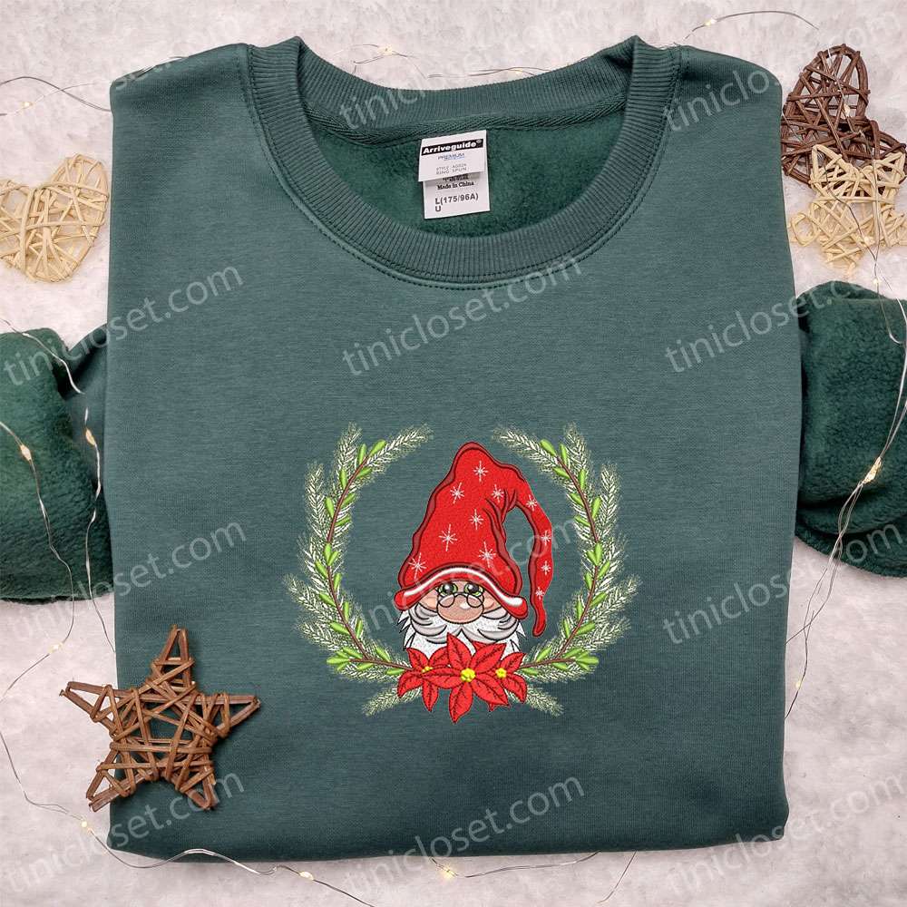 Gnome Christmas Wreath Embroidered T-shirt, Cozy Christmas Embroidered T-shirt, Best Christmas Gift Ideas For Family