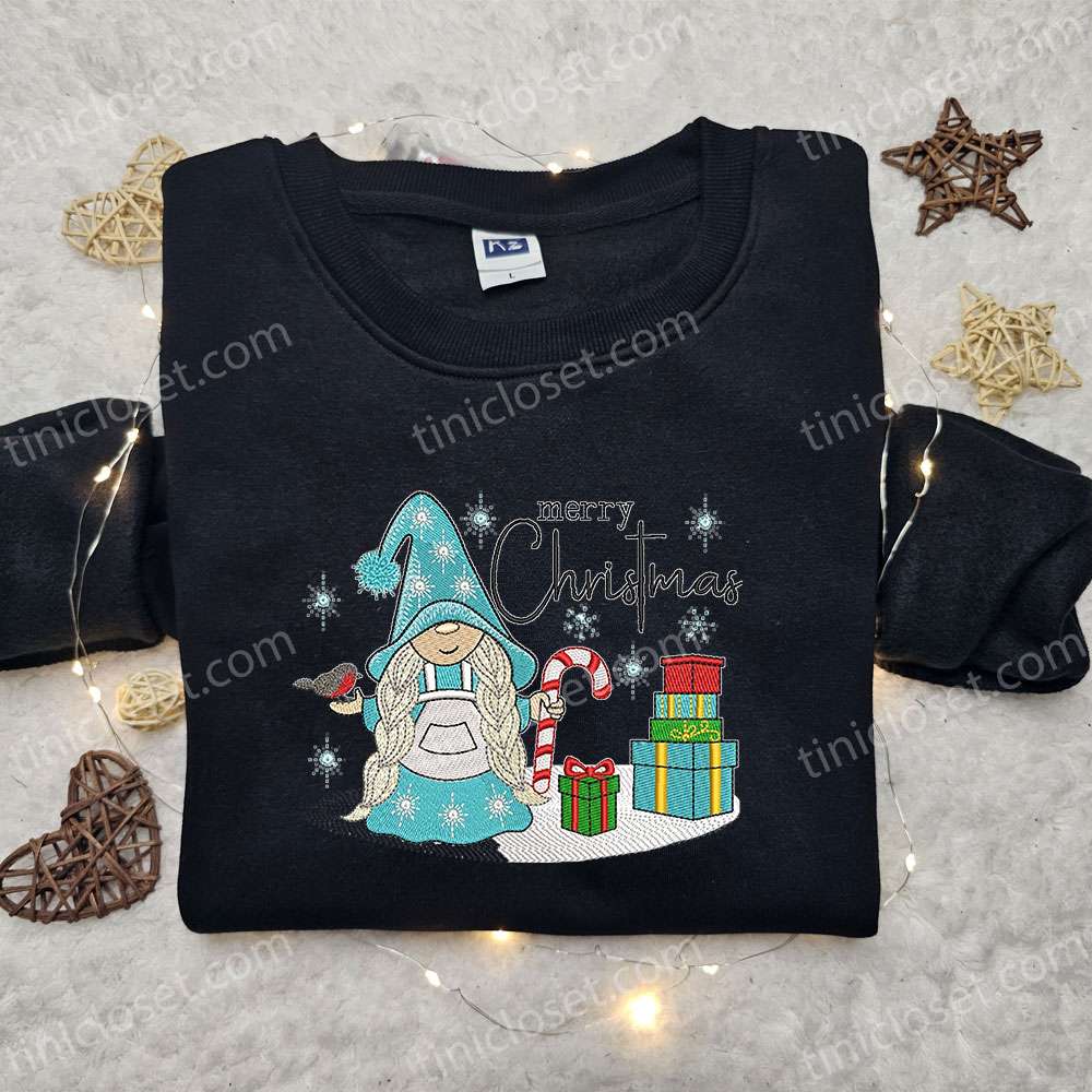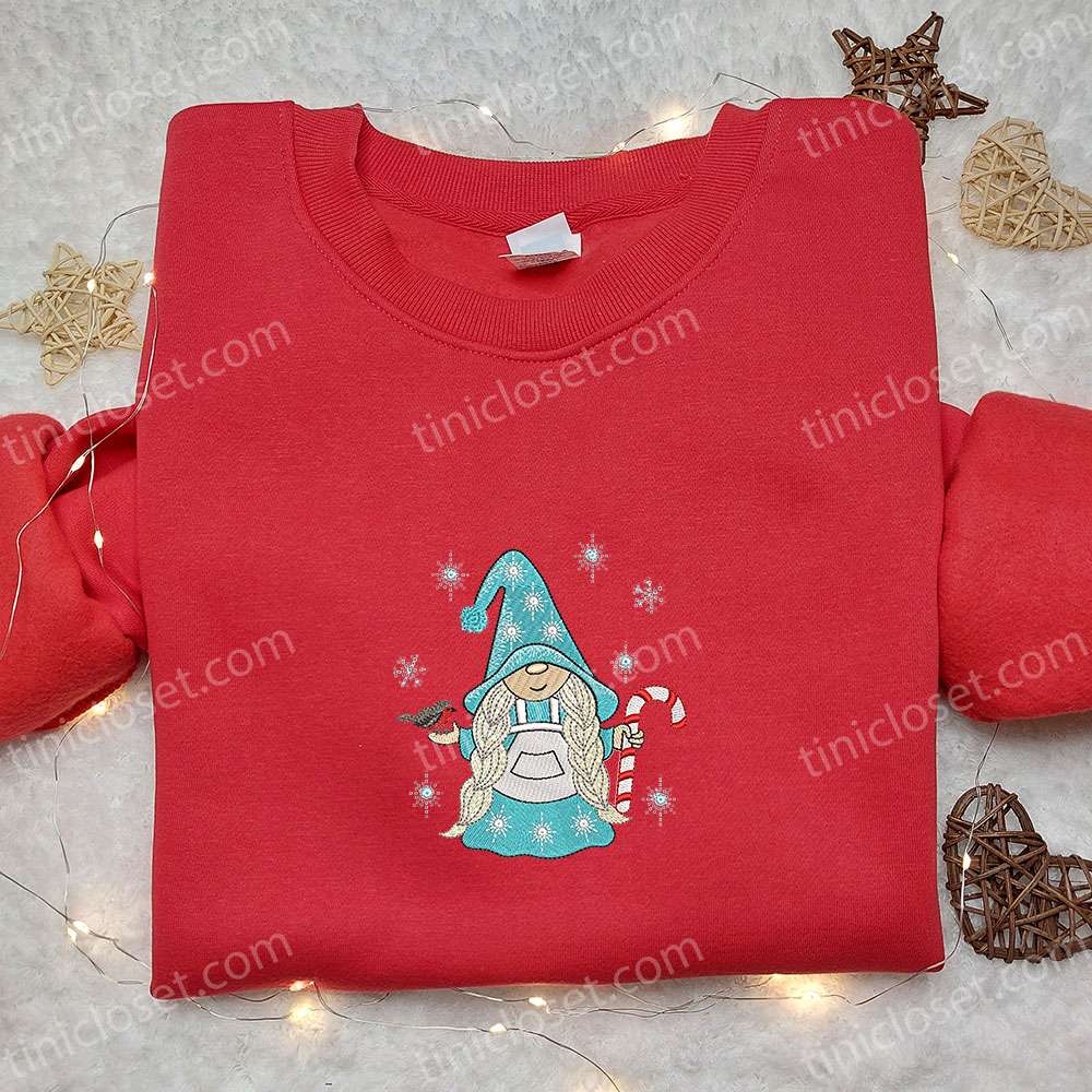 Gnome Girl With Candy Cane Christmas Embroidered T-shirt, Christmas Embroidered Sweatshirt, Best Christmas Gift Ideas