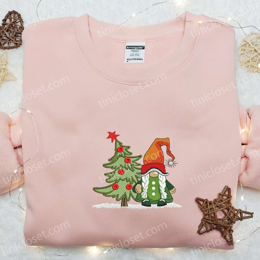 Gnome Girl Christmas Tree Embroidered T-shirt, Christmas Embroidered Hoodie, Best Christmas Gift Ideas For Family