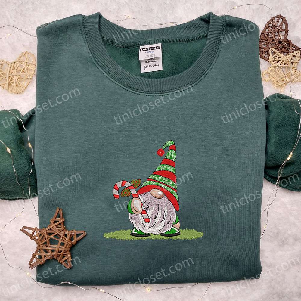 Gnome Holding Candy Cane Embroidered T-shirt, Cute Christmas Embroidered Sweatshirt, Best Christmas Gift Ideas For Family