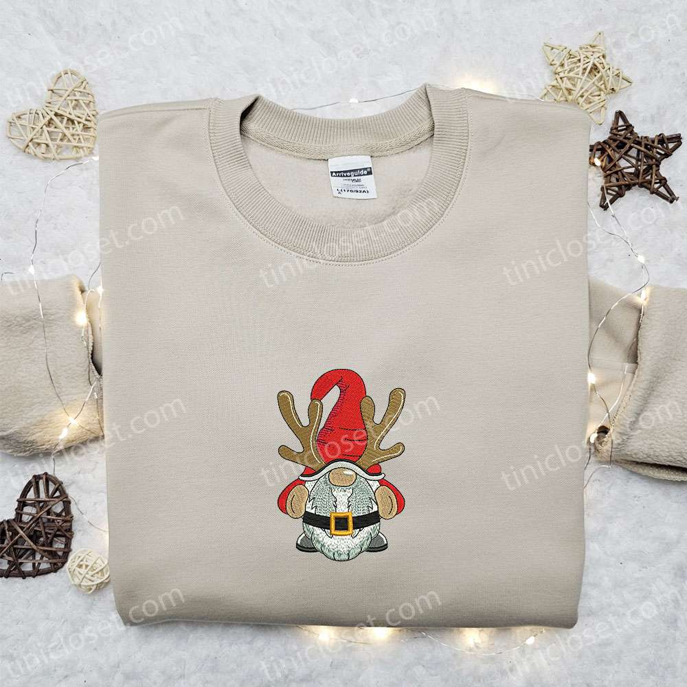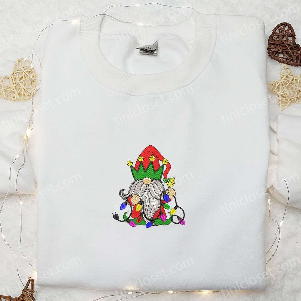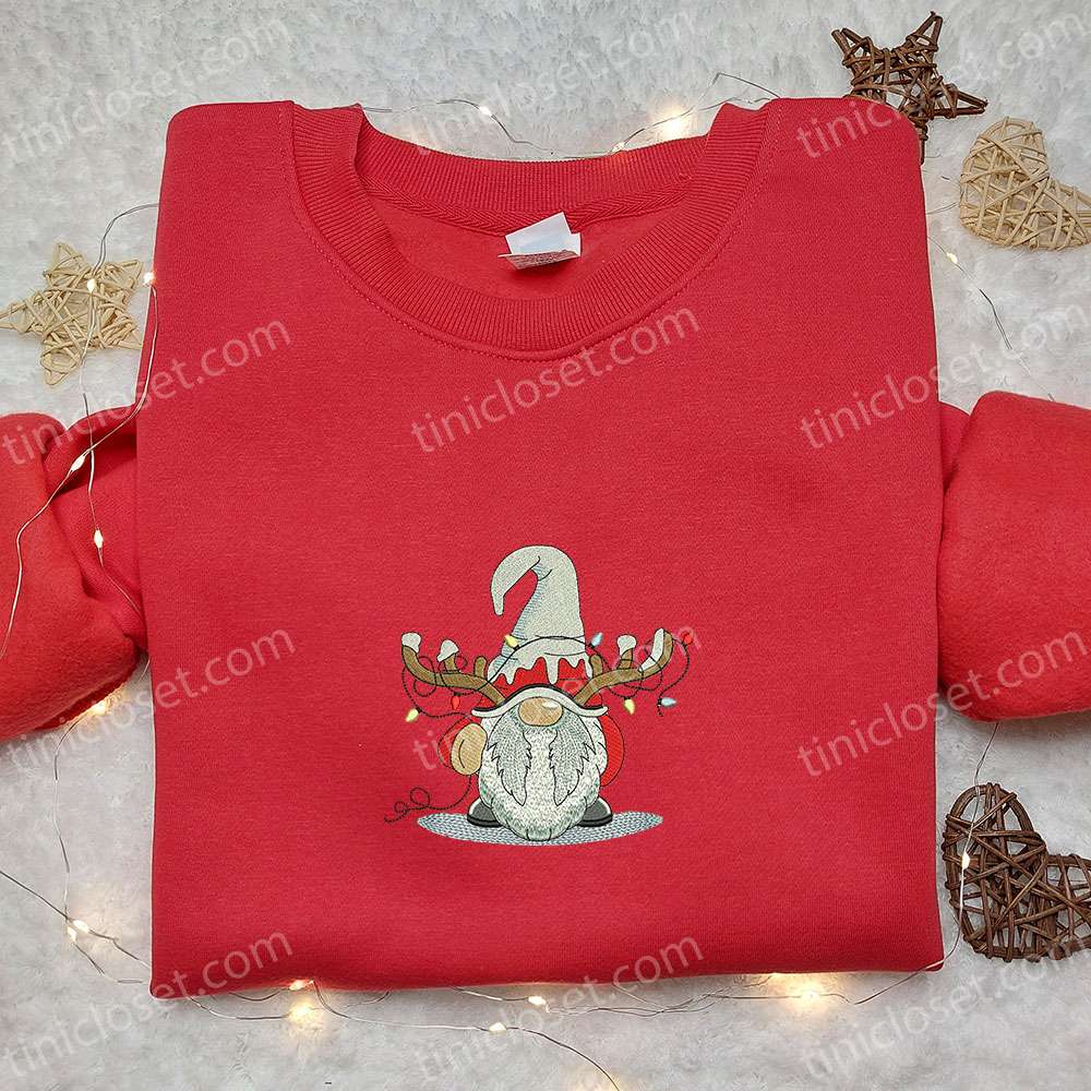 Gnome Reindeer Christmas Lights Embroidered Sweatshirt, Christmas Embroidered T-shirt, Best Christmas Gift Ideas