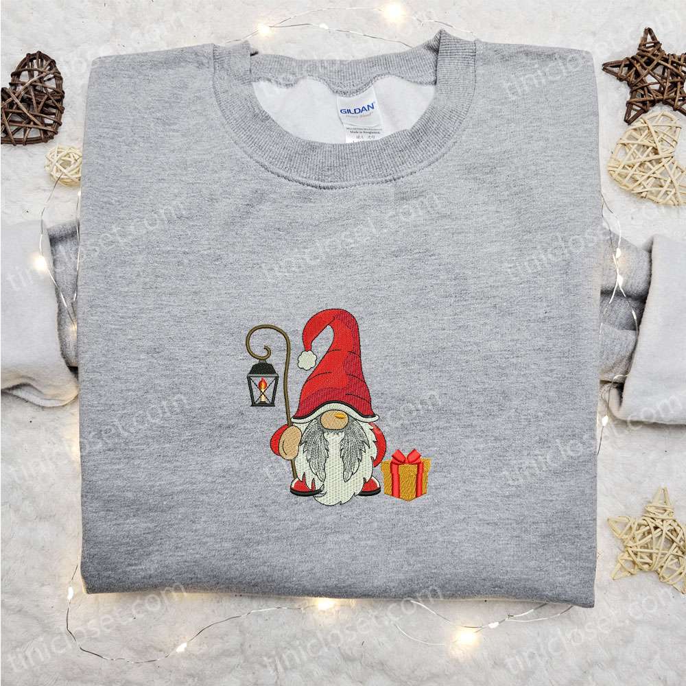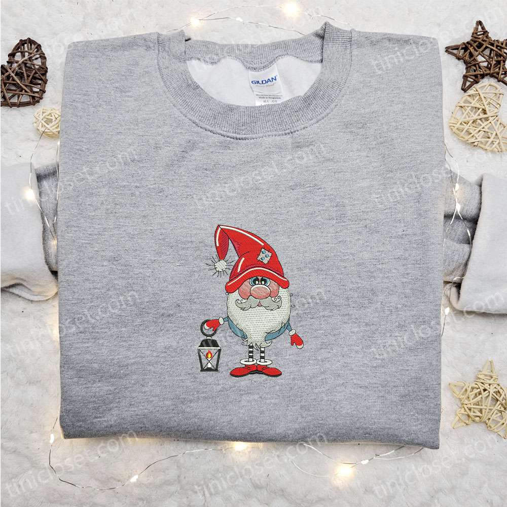 Gnome With Lantern Santa Embroidered T-shirt, Christmas Embroidered Sweatshirt, Best Christmas Gift Ideas For Family