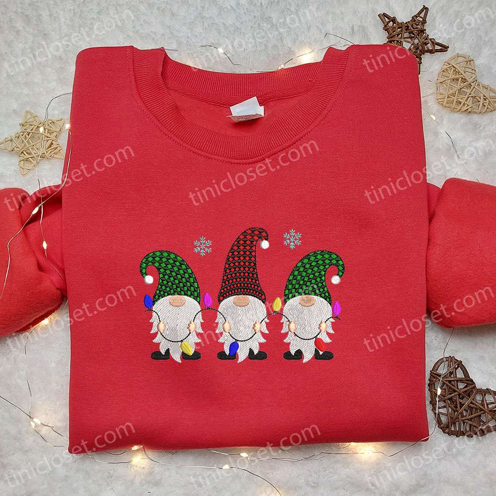 Gnomes Christmas Lights Embroidered Shirt, Cute Christmas Embroidered T-shirt, Best Christmas Gift Ideas