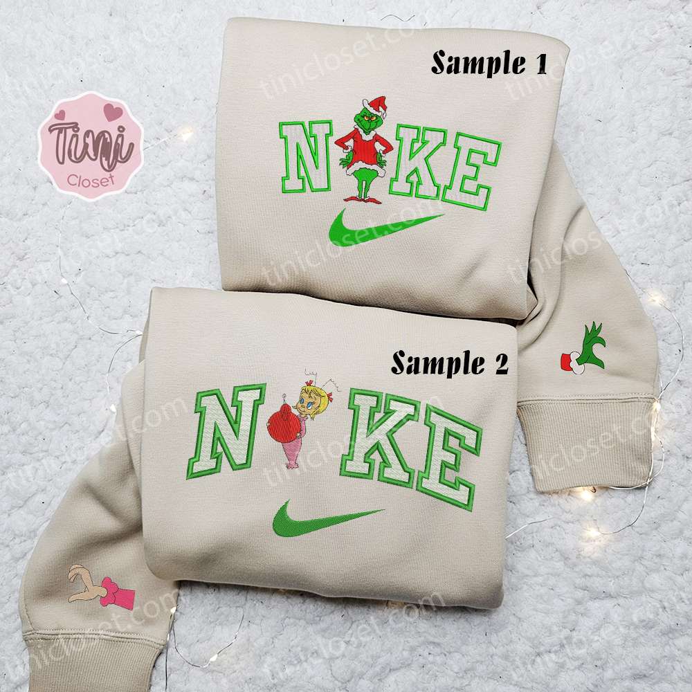Grinch And Cindy Lou X Nike Couple Embroidered Shirt, Christmas Embroidered Hoodie, Nike Inspired Embroidered Sweatshirt