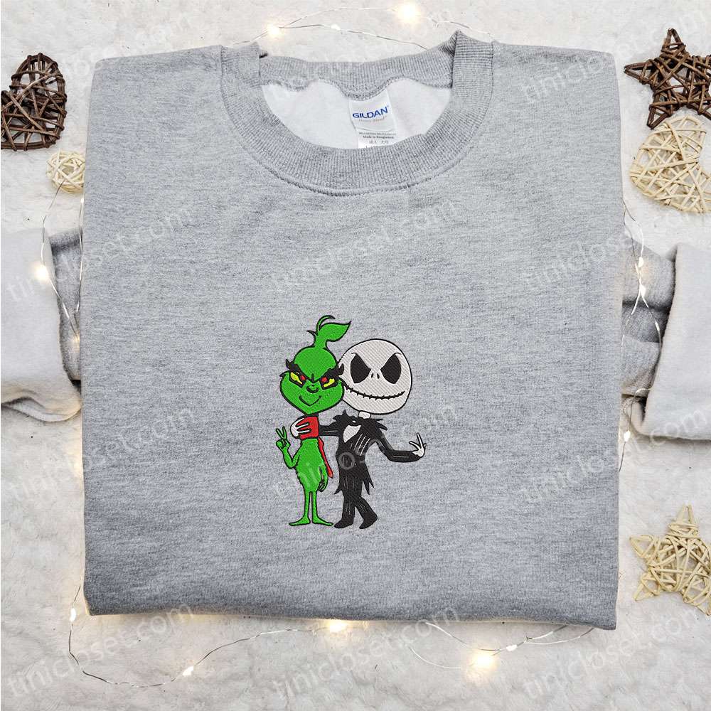 Grinch And Jack Skellington Embroidered Shirt, Christmas Embroidered Hoodie, Best Gifts For Family