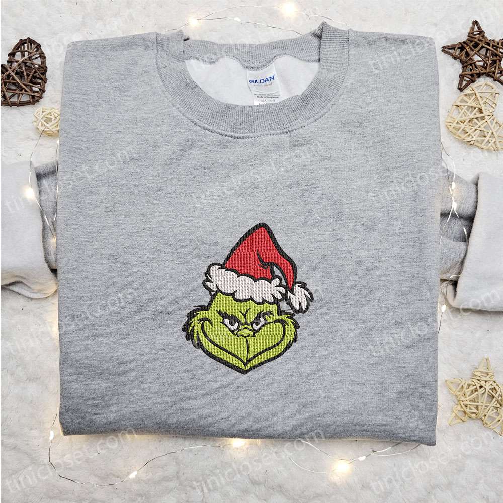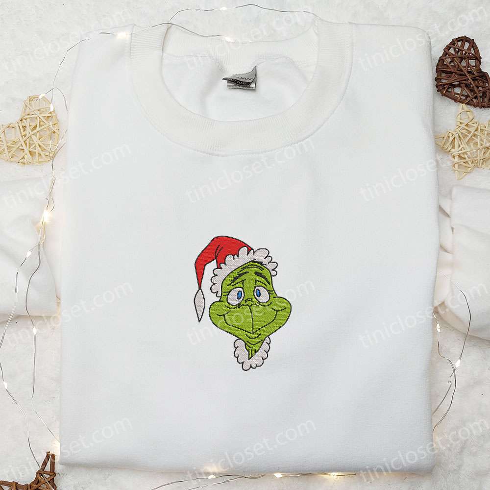 Grinch Head Christmas Embroidered T-shirt, Christmas Embroidered T-shirt, Best Christmas Gift Ideas For Family