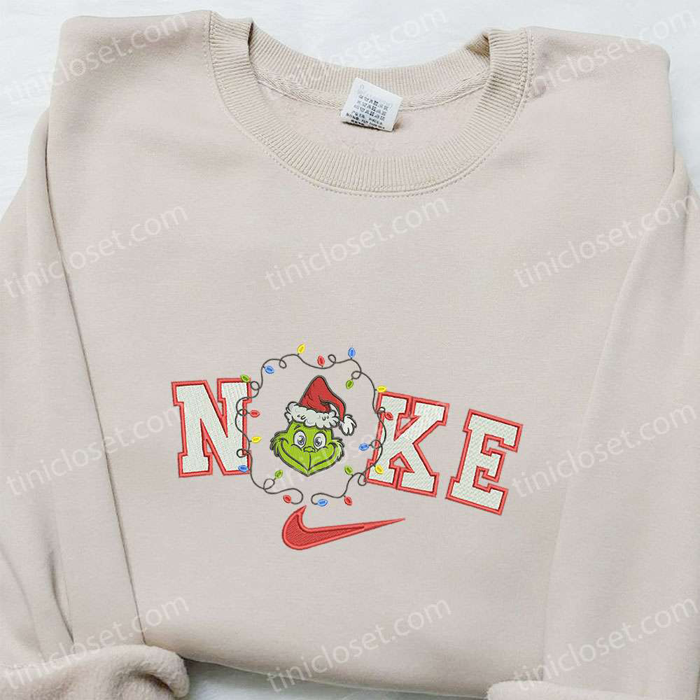 Grinch Head Light Xmas X Nike Christmas Embroidered Sweatshirt, Movie Christmas Embroidered Shirt, Best Christmas Gift Ideas