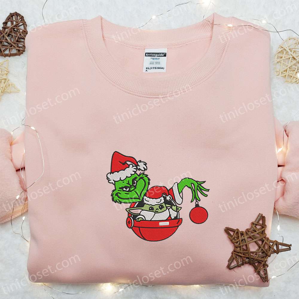 Grinch Holding Baby Yoda Christmas Embroidered Sweatshirt, Movie Christmas Embroidered Hoodie, Best Christmas Gift Ideas For Family