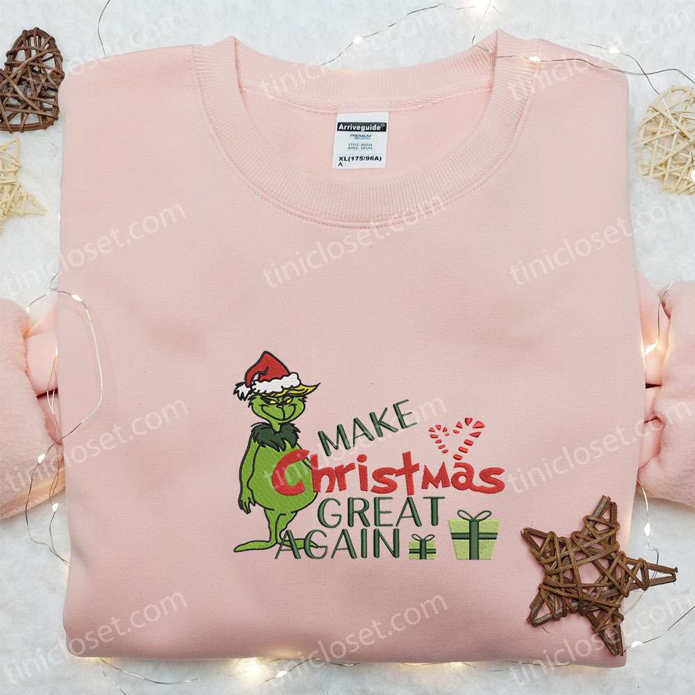 Grinch Make Christmas Great Again Embroidered Shirt, Cartoon Embroidered Hoodie, Christmas Embroidered Shirt