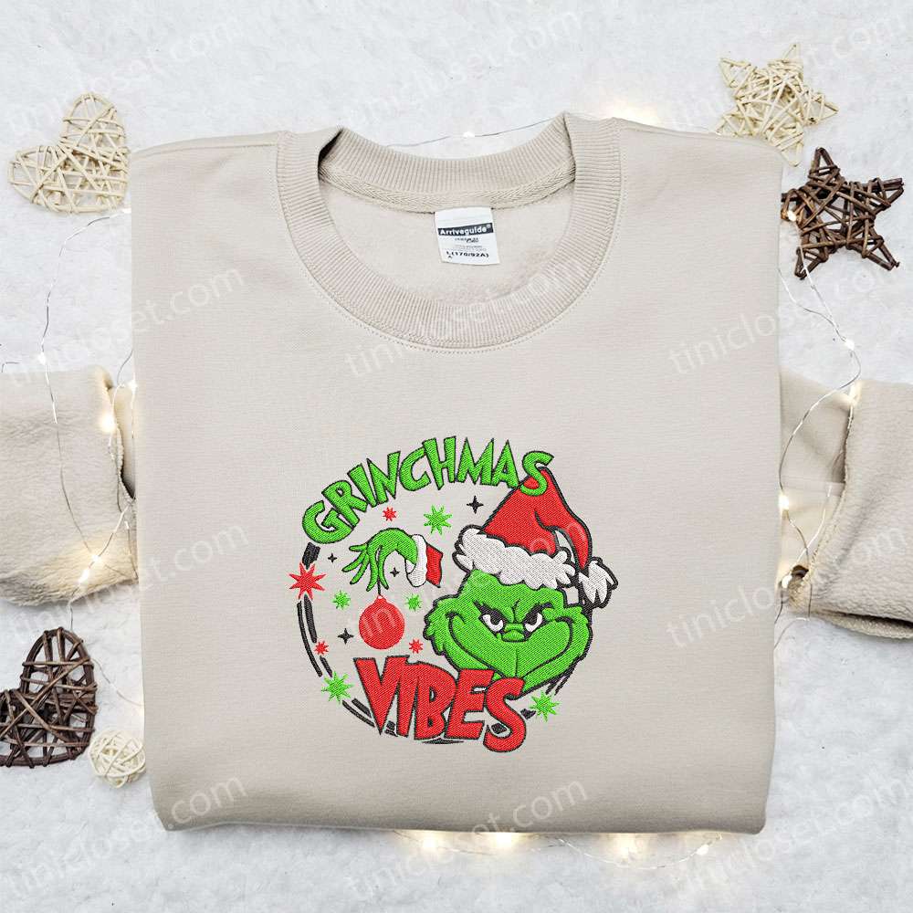 Grinchmas Vibes Embroidered T-shirt, Christmas Embroidered T-shirt, Best Christmas Gift Ideas For Family