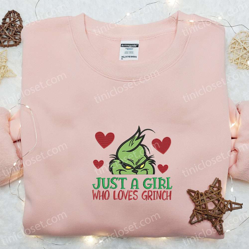 Just A Girl Who Loves Grinch Embroidered Shirt, Christmas Embroidered Hoodie, Best Gifts For Family